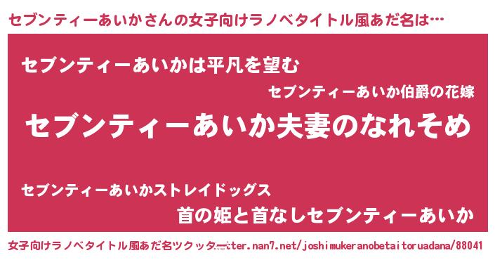 | 男性向けラノベタイトル風あだ名 | 『おまえをオタクにしてやるから、俺をセブンティーあいかにしてくれ! 』 |