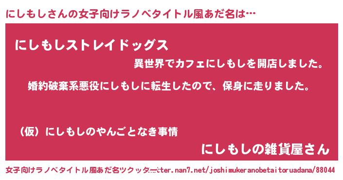 | 男性向けラノベタイトル風あだ名 | 『ニシモシスレイヤー』『にしもしの憂鬱』 |