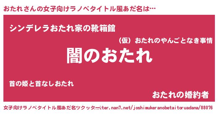 | 男性向けラノベタイトル風あだ名 | 『Re:おたれから始める異世界生活』 |