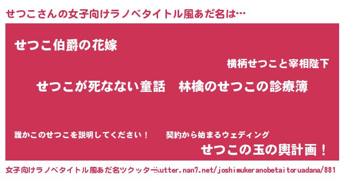 | 男性向けラノベタイトル風あだ名 | 『魔弾の王とせつこ』 |