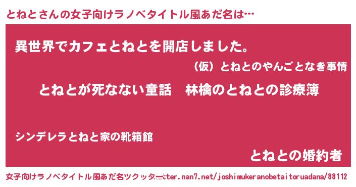 | 男性向けラノベタイトル風あだ名 | 『魔弾の王ととねと』『とねとの憂鬱』 |