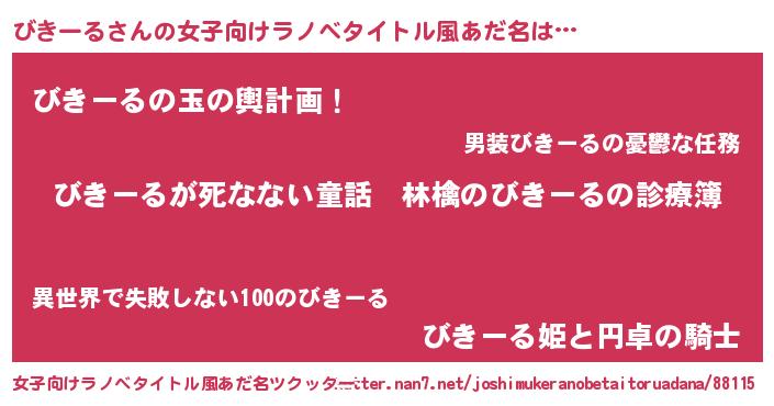 | 男性向けラノベタイトル風あだ名 | 『魔弾の王とびきーる』『びきーるの憂鬱』 |