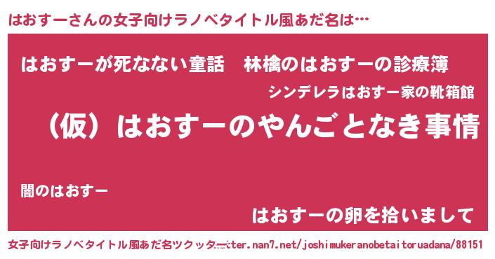 | 男性向けラノベタイトル風あだ名 | 『はおすーの憂鬱』『魔弾の王とはおすー』 |