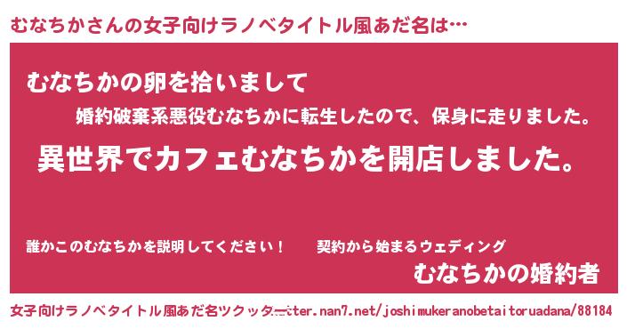 むなちかさんの女子向けラノベタイトル風あだ名は… 『異世界でカフェむなちかを開店しました。』『むなちかの卵を拾いまして』『むなちかの婚約者』 ツクッター #女子向けラノベタイトル風あだ名ツクッター http://tkutter.nan7.net/joshimukeranobetaitoruadana/88184/