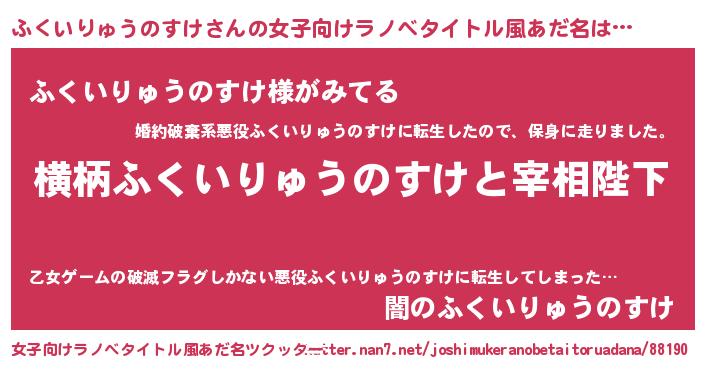 | 男性向けラノベタイトル風あだ名 | 『ふくいりゅうのすけに滅ぼされるだけの簡単なお仕事です』 |