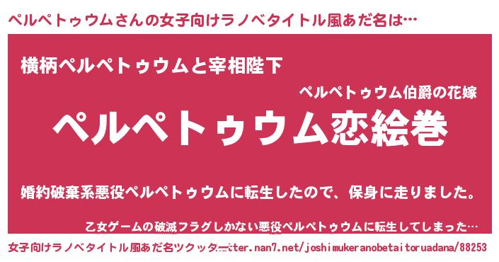 | 男性向けラノベタイトル風あだ名 | 『ノーゲーム・ノーペルペトゥウム』 |