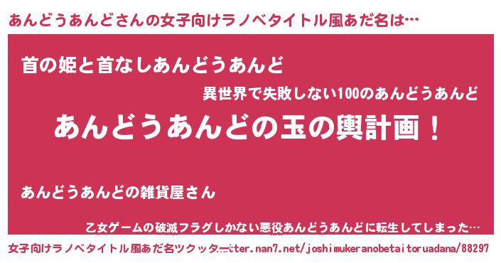 | 胡散臭い通販商品みたいなあだ名 | 『あなたにだけ特別に提供する世界で10本だけ現存している希少なブランデー…その名も「あんどうあんど」』 |