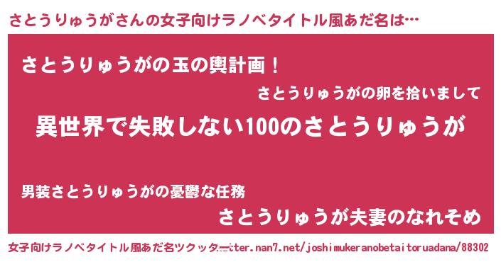 | 胡散臭い通販商品みたいなあだ名 | 『絶対に幸福をもたらす水素水…その名も「さとうりゅうが」』 |
