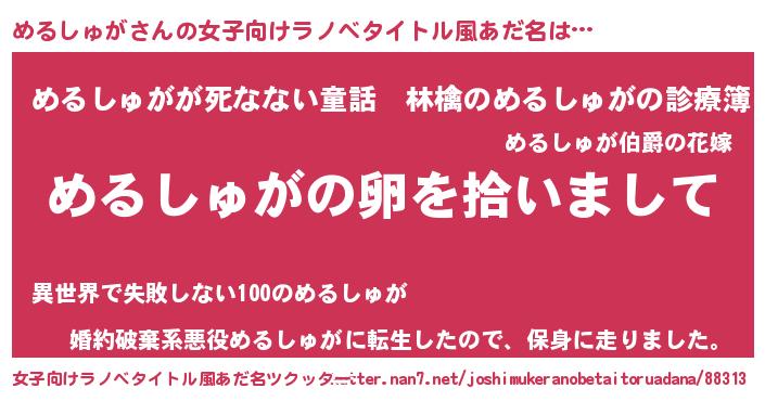 | 男性向けラノベタイトル風あだ名 | 『めるしゅがの嫁は女の子じゃないと思った?』 |