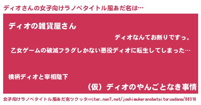 | 男性向けラノベタイトル風あだ名 | 『この素晴らしい世界にディオを!』 |