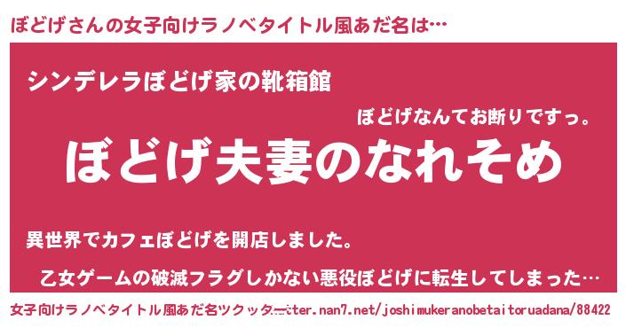| 男性向けラノベタイトル風あだ名 | 『おまえをオタクにしてやるから、俺をぼどげにしてくれ! 』 |