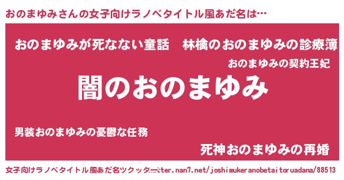 | 男性向けラノベタイトル風あだ名 | 『Re:おのまゆみから始める異世界生活』 |