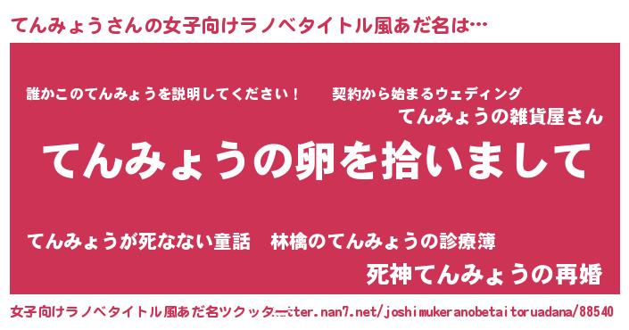 | 男性向けラノベタイトル風あだ名 | 『ダンジョンにてんみょうを求めるのは間違っているだろうか』 |