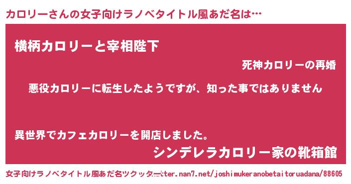 カロリーさんの女子向けラノベタイトル風あだ名は… 『悪役カロリーに転生したようですが、知った事ではありません』『横柄カロリーと宰相陛下』『シンデレラカロリー家の靴箱館』 ツクッター #女子向けラノベタイトル風あだ名ツクッター http://tkutter.nan7.net/joshimukeranobetaitoruadana/88605/