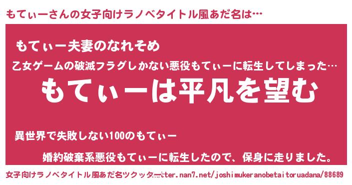 | 男性向けラノベタイトル風あだ名 | 『ダンジョンにもてぃーを求めるのは間違っているだろうか』 |