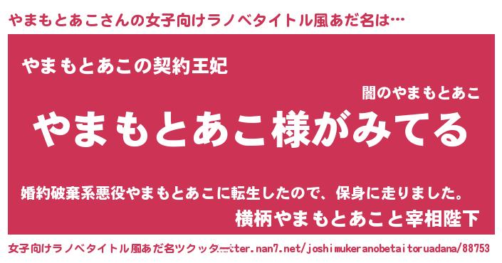 | 男性向けラノベタイトル風あだ名 | 『やまもとあこの嫁は女の子じゃないと思った?』 |