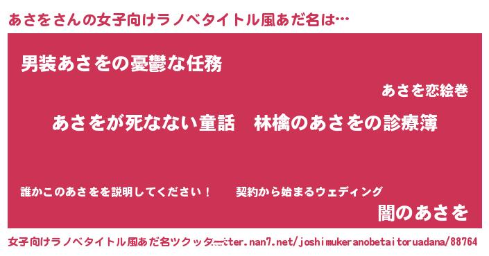 | 男性向けラノベタイトル風あだ名 | 『魔弾の王とあさを』 |