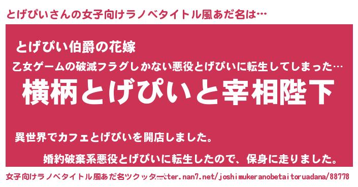 | 男性向けラノベタイトル風あだ名 | 『とげぴいに滅ぼされるだけの簡単なお仕事です』 |