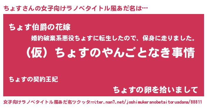 ちょすさんの女子向けラノベタイトル風あだ名は… 『(仮)ちょすのやんごとなき事情』『ちょす伯爵の花嫁』『ちょすの卵を拾いまして』 ツクッター #女子向けラノベタイトル風あだ名ツクッター http://tkutter.nan7.net/joshimukeranobetaitoruadana/88811/