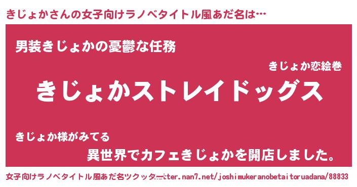 | 男性向けラノベタイトル風あだ名 | 『Re:きじょかから始める異世界生活』 |