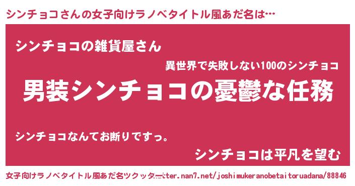 | 男性向けラノベタイトル風あだ名 | 『冴えないシンチョコの育てかた』 |