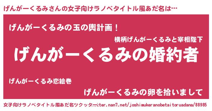 げんがーくるみさんの女子向けラノベタイトル風あだ名は… 『げんがーくるみの婚約者』『げんがーくるみの玉の輿計画!』『げんがーくるみの卵を拾いまして』 ツクッター #女子向けラノベタイトル風あだ名ツクッター http://tkutter.nan7.net/joshimukeranobetaitoruadana/88985/