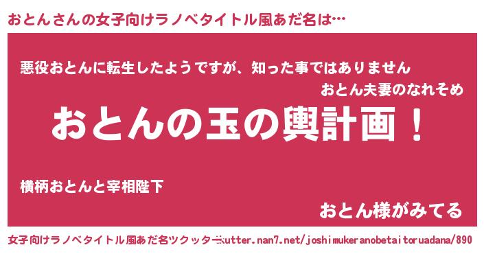 | 男性向けラノベタイトル風あだ名 | 『おとん~年齢イコール彼女いない歴の魔法使い~』 |