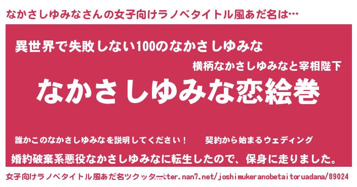 | 男性向けラノベタイトル風あだ名 | 『おまえをオタクにしてやるから、俺をなかさしゆみなにしてくれ! 』 |