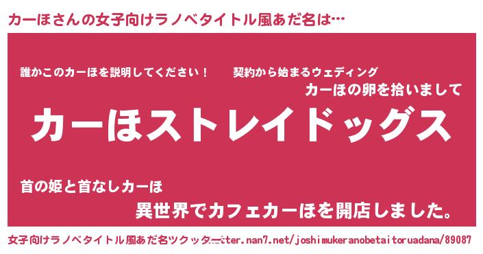 | 男性向けラノベタイトル風あだ名 | 『Re:カーほから始める異世界生活』 |
