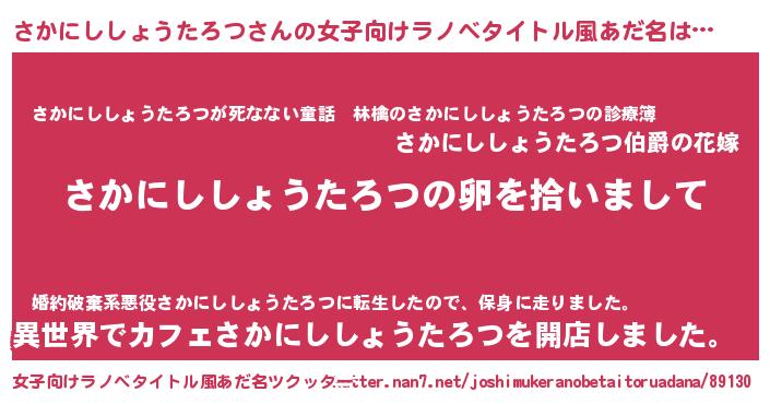 | 男性向けラノベタイトル風あだ名 | 『ダンジョンにさかにししょうたろつを求めるのは間違っているだろうか』 |