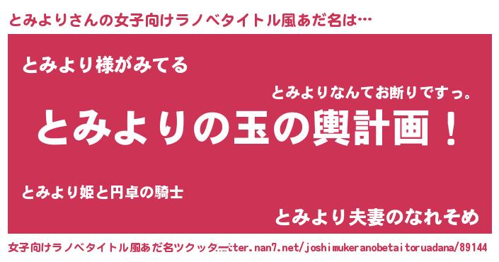 | 男性向けラノベタイトル風あだ名 | 『とみより~年齢イコール彼女いない歴の魔法使い~』 |