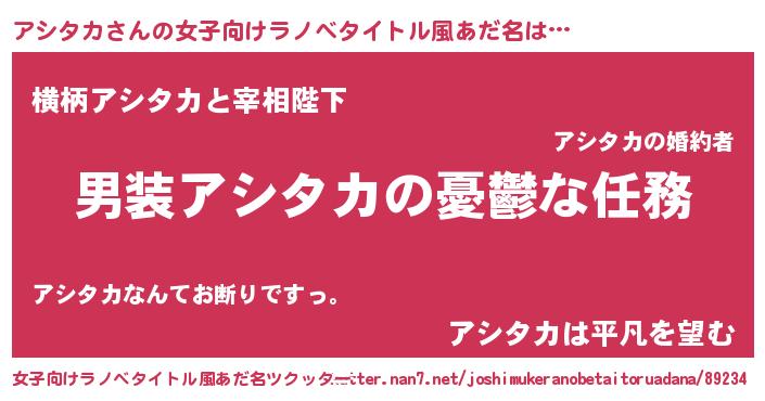 | 男性向けラノベタイトル風あだ名 | 『冴えないアシタカの育てかた』 |