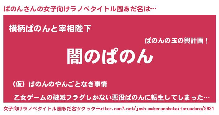 | 男性向けラノベタイトル風あだ名 | 『Re:ぱのんから始める異世界生活』 |