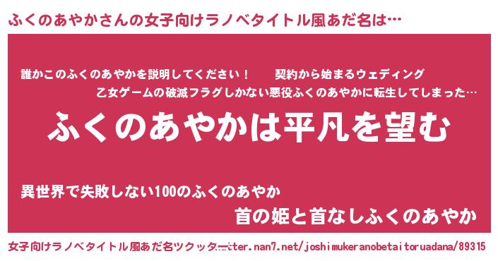 | 男性向けラノベタイトル風あだ名 | 『ダンジョンにふくのあやかを求めるのは間違っているだろうか』 |