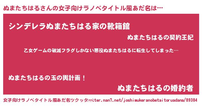 | 男性向けラノベタイトル風あだ名 | 『魔弾の王とぬまたちはる』 |