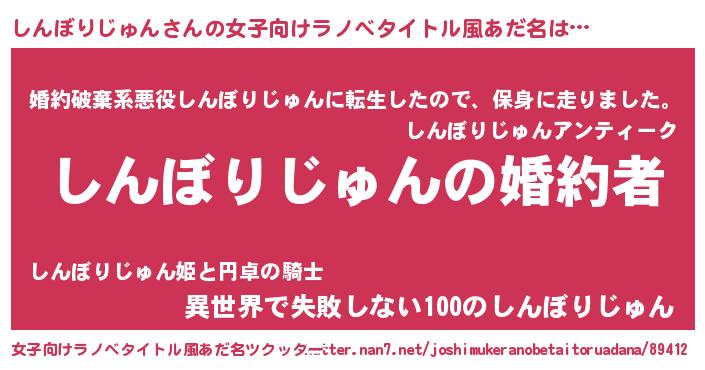 | 男性向けラノベタイトル風あだ名 | 『うちの娘の為ならば、俺はもしかしたらしんぼりじゅんも倒せるかもしれない。』 |