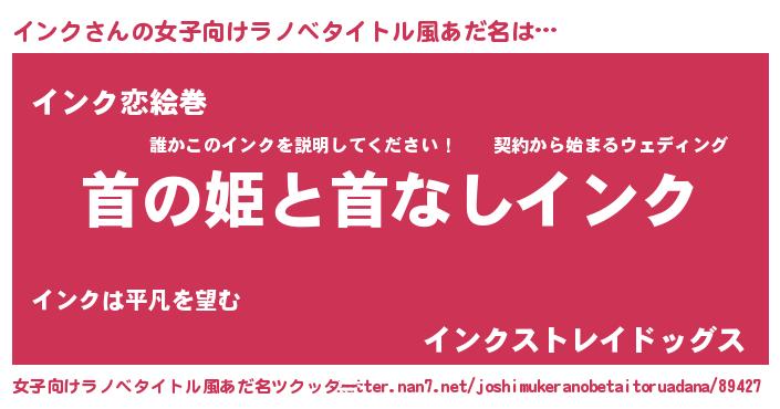インクさんの女子向けラノベタイトル風あだ名は… 『首の姫と首なしインク』『インク恋絵巻』『インクストレイドッグス』 ツクッター #女子向けラノベタイトル風あだ名ツクッター http://tkutter.nan7.net/joshimukeranobetaitoruadana/89427/