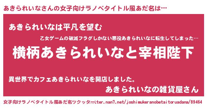 | 男性向けラノベタイトル風あだ名 | 『あきられいなに滅ぼされるだけの簡単なお仕事です』 |