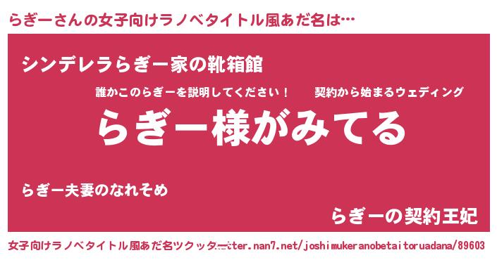 | 男性向けラノベタイトル風あだ名 | 『らぎーの嫁は女の子じゃないと思った?』 |