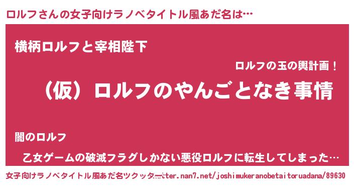 | 男性向けラノベタイトル風あだ名 | 『ロルフの憂鬱』『魔弾の王とロルフ』 |