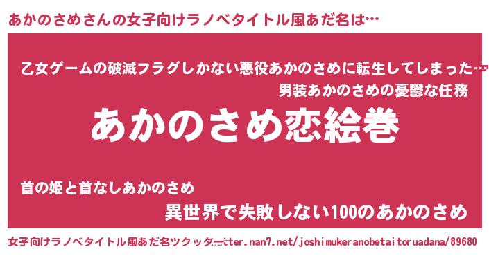 | 男性向けラノベタイトル風あだ名 | 『おまえをオタクにしてやるから、俺をあかのさめにしてくれ! 』 |