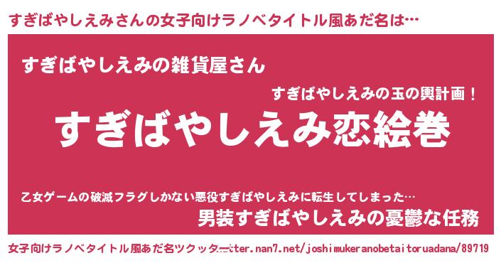 | 男性向けラノベタイトル風あだ名 | 『おまえをオタクにしてやるから、俺をすぎばやしえみにしてくれ! 』 |