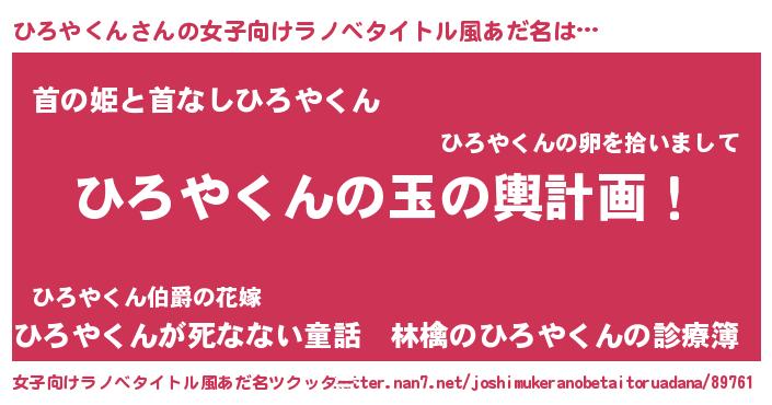 | 男性向けラノベタイトル風あだ名 | 『ひろやくん~年齢イコール彼女いない歴の魔法使い~』 |