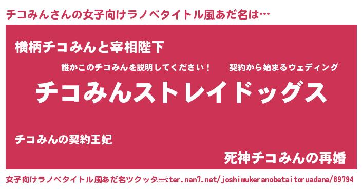 | 男性向けラノベタイトル風あだ名 | 『Re:チコみんから始める異世界生活』 |