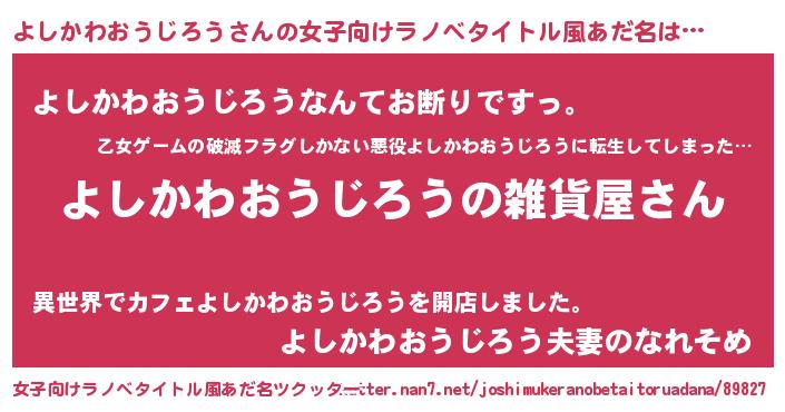 | 男性向けラノベタイトル風あだ名 | 『やはりよしかわおうじろうの青春ラブコメはまちがっている 』 |