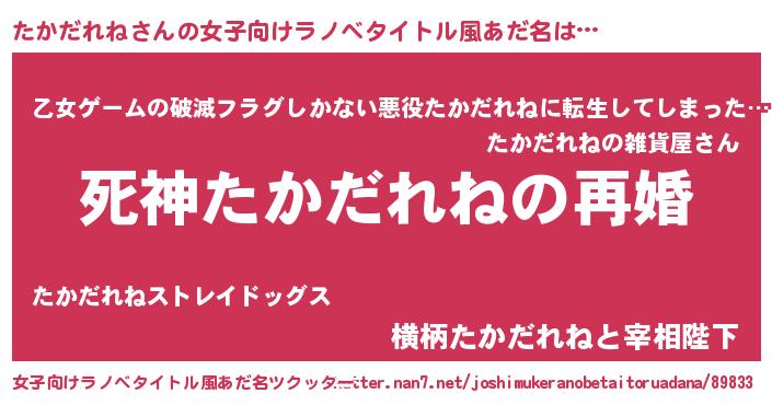 | 男性向けラノベタイトル風あだ名 | 『ノーゲーム・ノータカダレネ』 |