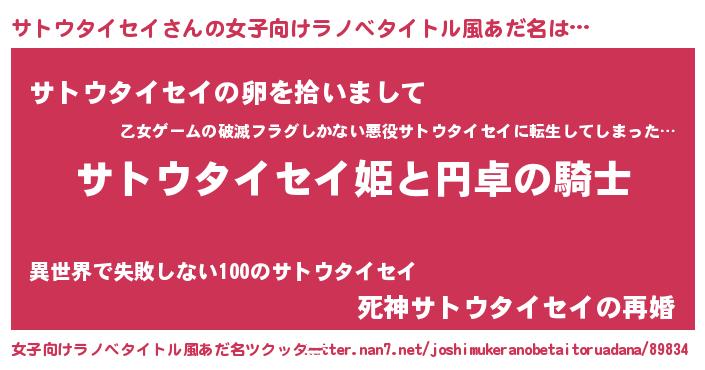 | 男性向けラノベタイトル風あだ名 | 『サトウタイセイアートオンライン』 |