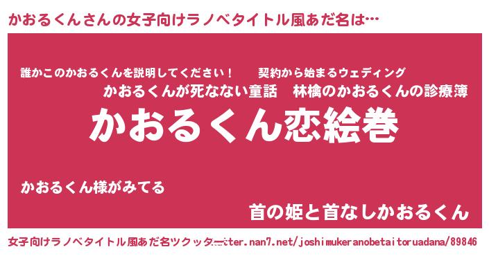 かおるくんさんの女子向けラノベタイトル風あだ名は… 『かおるくん恋絵巻』『誰かこのかおるくんを説明してください! ~契約から始まるウェディング~』『首の姫と首なしかおるくん』 ツクッター #女子向けラノベタイトル風あだ名ツクッター http://tkutter.nan7.net/joshimukeranobetaitoruadana/89846/