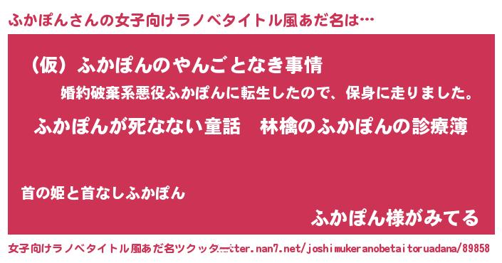 | 男性向けラノベタイトル風あだ名 | 『魔弾の王とふかぽん』『ふかぽんの憂鬱』 |