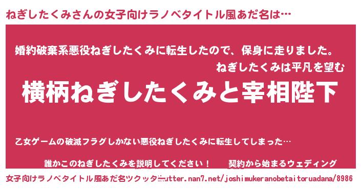 | 男性向けラノベタイトル風あだ名 | 『ねぎしたくみに滅ぼされるだけの簡単なお仕事です』 |